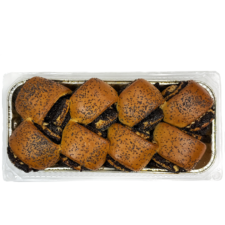 Ingredients: wheat flour (wheat flour, niacin, reduced iron, ascorbic acid, thiamine mononitrate, riboflavin, amylase, folic acid), water, margarine (palm oil, modified palm oil, canola oil, water, mono and diglycerides, soy lecithin, citric acid, natural flavor, beta carotene), poppy seed filling (poppy seeds, water, citric acid, honey, sodium alginate, salt, preservatives- potassium sorbate, sodium benzoate, sodium bicarbonate, propylene glycol ), egg powder, sugar, yeast, salt, dough improver (enriched wheat flour, diacetyl tartaric acid esters of mono- and diglycerides, calcium carbonate, sunflower oil, ascorbic acid, amylase, xylanase), vanilla flavor (water, propylene glycol, artificial & natural favors). Allergen Information: wheat, soy and eggs.